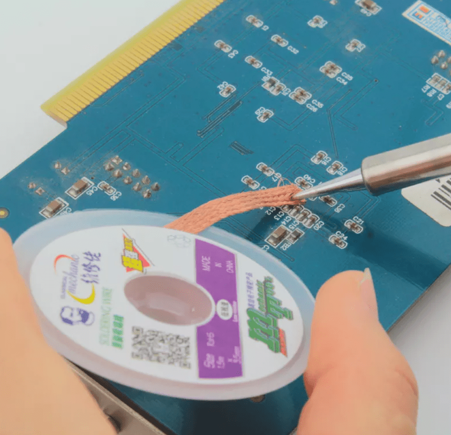 1. Place the desoldering wick over the solder to be removed, then push the heated soldering iron tip onto the desoldering wick. The solder will be absorbed.