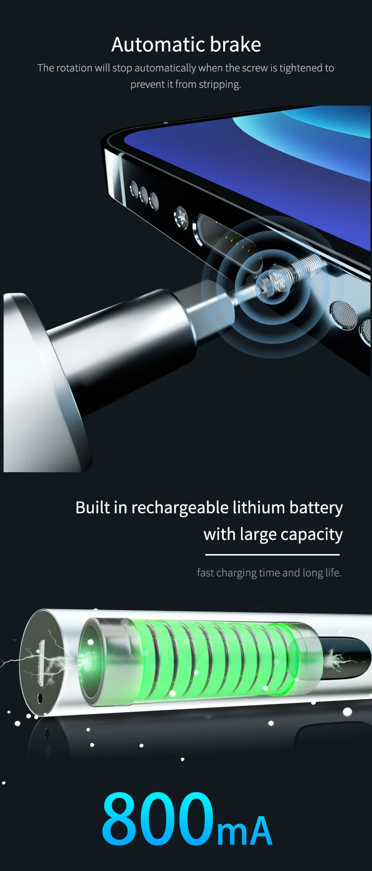 Automatic brake, the rotation will stop automatically when the screw is tightened to prevent it from stripping.