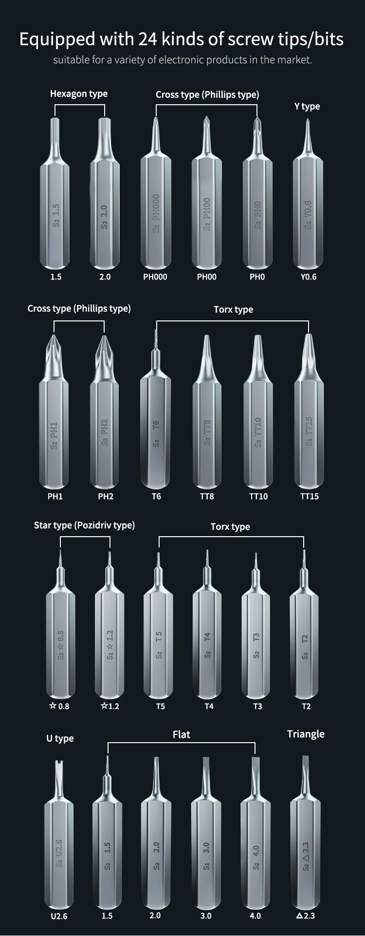 Equipped with 24 kinds of screw tips/bits, suitable for a variety of electronic products in the market. Such as Flat type, Cross type (Phillips type), Hexagon type, Y type, Torx type, Star type (Pozidriv type), U type and Triangle type.