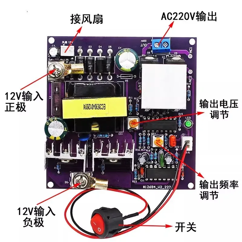 1. INVERTER MODULE: This 300W boost module inputs DC12V, outputs AC180 to 220V, 50Hz, correction sine wave, with high energy efficiency and low power consumption.