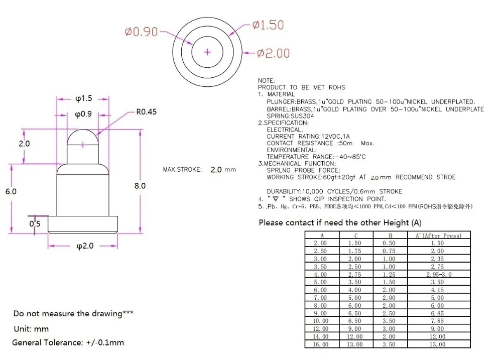 4. Spring force:50 gf