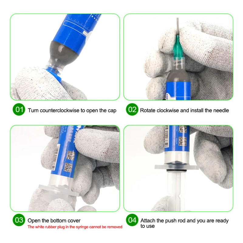 Syringe type paste, welding is not wasteful, more precise, and the sealing plug can be reused after use.