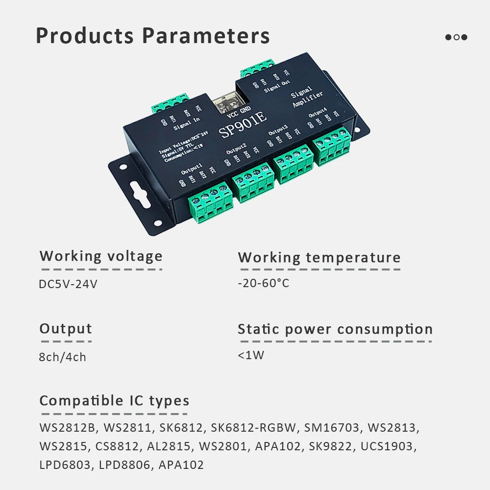 SP901E SPI Signal Amplifier for WS2812B WS2811 WS2813 Pixel RGB LED Strip Signal Repeater Addressable Dream Color Tape DC 5V-12V