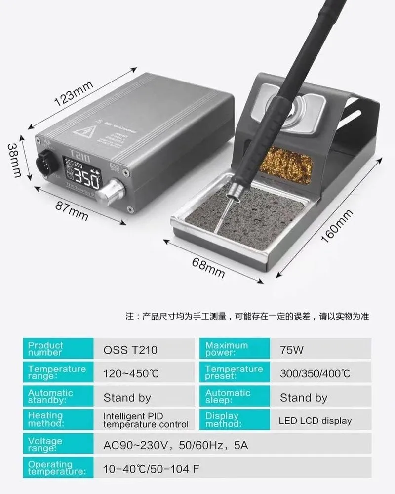 The T210 Digital Soldering Iron Station Kit 75W is a high-performance soldering solution designed for precision electronics work and professional-grade soldering tasks. Featuring a sleek digital control interface, this station offers accurate temperature regulation, typically ranging from 100°C to 480°C, allowing users to fine-tune heat settings for different soldering needs.