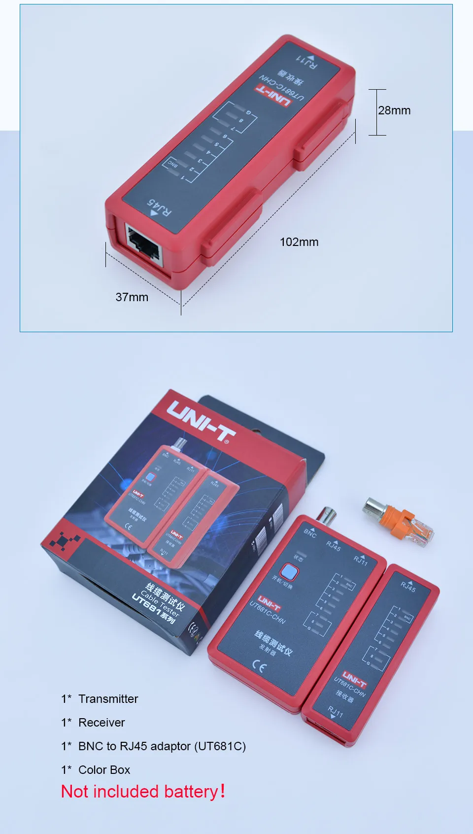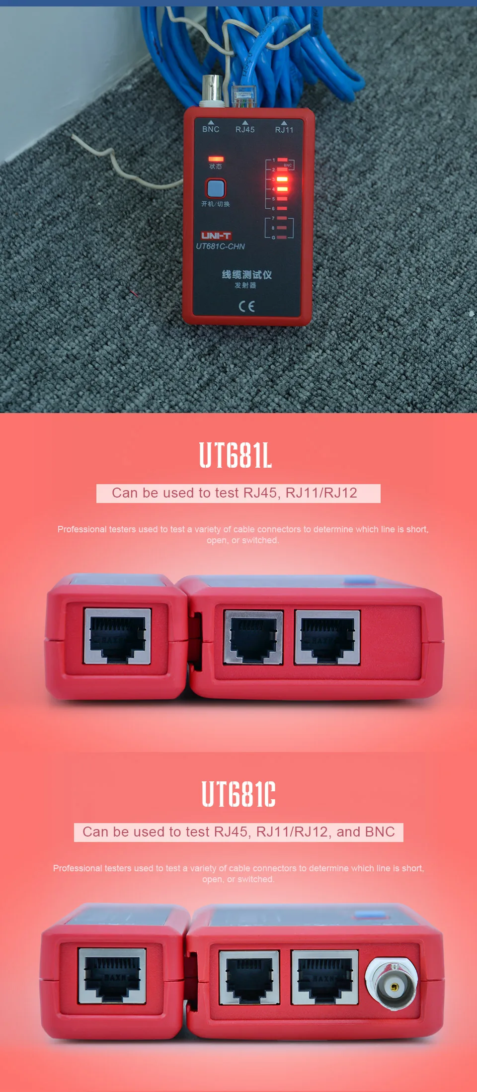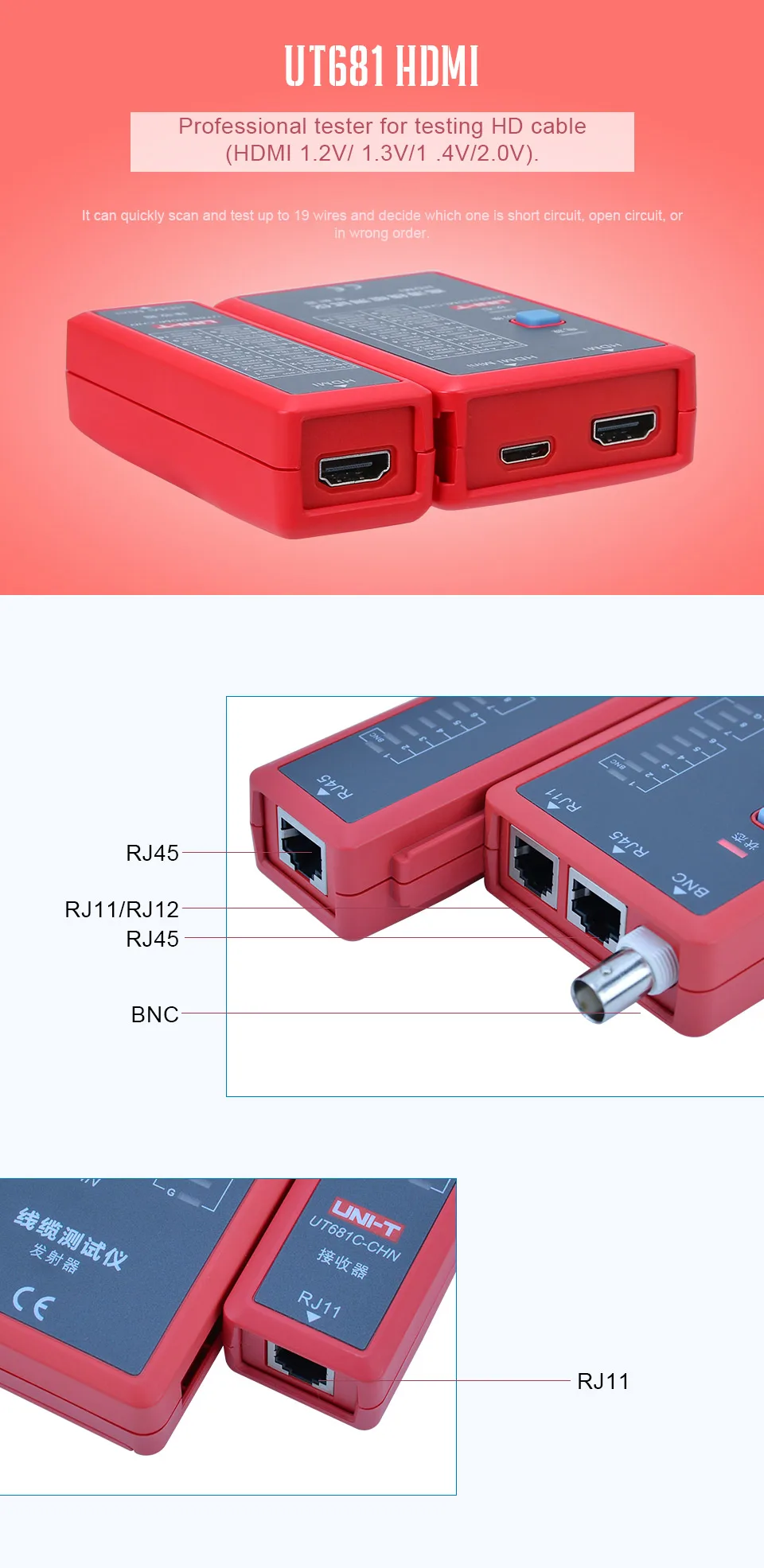 2. Auto check of open/short/crossovercircuit3. Single key operation4. Manual/auto power off (after10-minute inactivity)5. Low battery indication6. Power supplied by 9V batterySpecifications Range UT681L UT681C UT681HDMI Description Test function To test for: RJ45/RJ11 √ To test for: RJ45/RJ11/BNC √ Need to use RJ45 to BNC adaptor To test for: HDMI/MINI-HDMI √ Fast test mode √ √ LED1~LED8, LED_G Slow test mode √ √ LED1~LED8, LED_G Scan test mode √ LED1~LED19, LED_S Full display test mode √ LED1~LED19, LED_S To test for the case of short circuit, crossover, open circuit, etc. √ √ √ Ethernet cable: shielded/ unshielded test √ √ √ Manual shutdown function √ √ √ Auto shutdown function √ √ √ No operation within 10 minutes, the device will shut down automatically Single key operation √ √ √ Power supply: 9V battery √ √ √ Low battery detection √ √ √ Less than 7.2V Application environment Operating temperature: 0~40℃ √ √ √ Storage temperature: -10~50℃ √ √ √ Operating humidity: 20~80%RH √ √ √ Storage humidity: 10~90%RH √ √ √ Altitude: ≤2000 meters √ √ √ Safety standard CE EN61326-1: 2013; EN61326-2-2: 2013 √ √ √ General Characterisitics Product color Red and grey Product net weight Transmitter: 87g; receiver: 51g Product size Transmitter: 102mm x 62mm x 28mm; receiver: 102mm x 37mm x 28mm Standard accessories 9V battery, BNC to RJ45 adaptor (UT681C) NOT INCLUDE BATTERY Standard individual packing Gift box, English manual