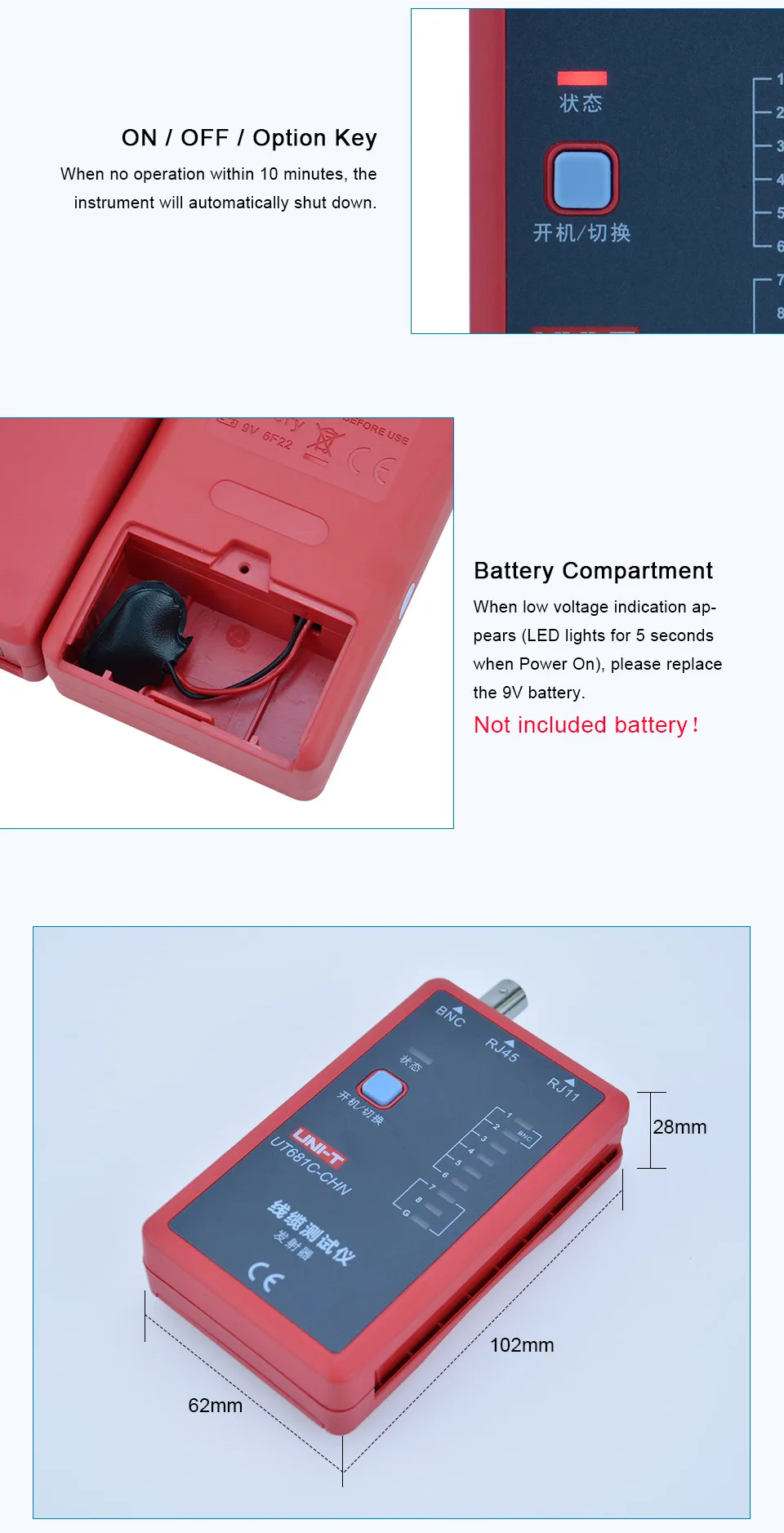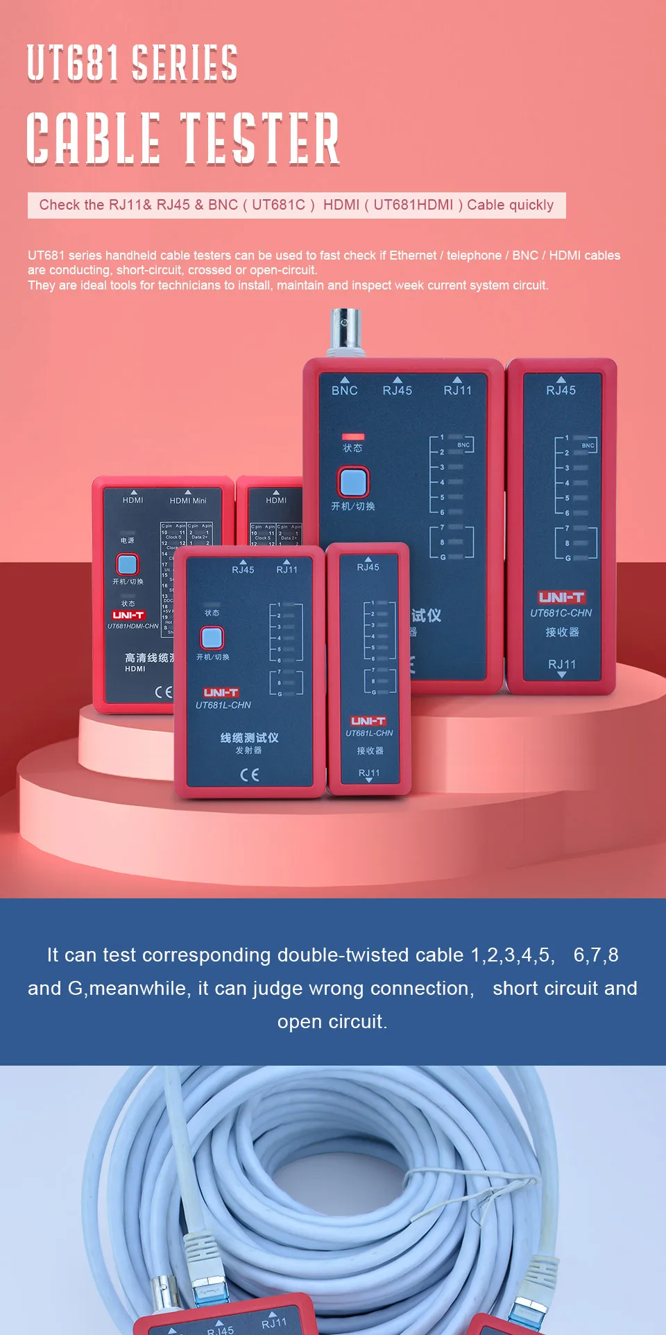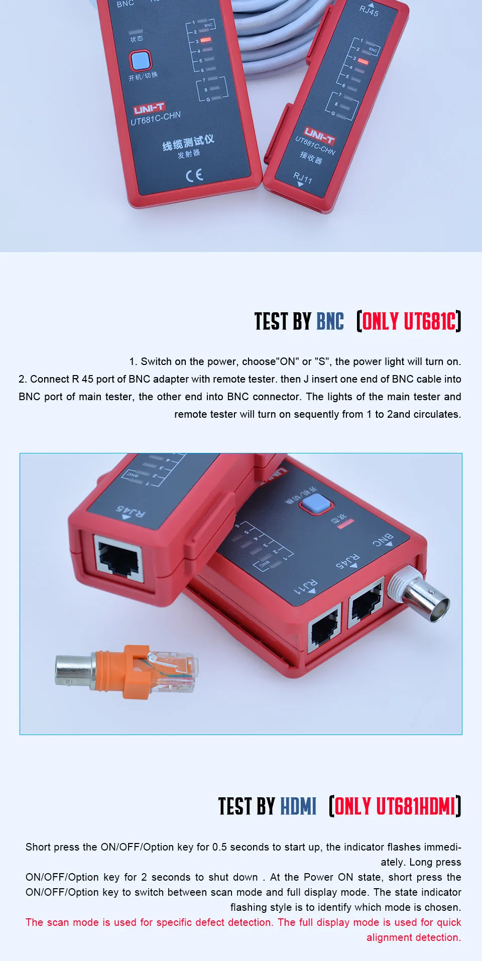 2. Auto check of open/short/crossovercircuit3. Single key operation4. Manual/auto power off (after10-minute inactivity)5. Low battery indication6. Power supplied by 9V batterySpecifications Range UT681L UT681C UT681HDMI Description Test function To test for: RJ45/RJ11 √ To test for: RJ45/RJ11/BNC √ Need to use RJ45 to BNC adaptor To test for: HDMI/MINI-HDMI √ Fast test mode √ √ LED1~LED8, LED_G Slow test mode √ √ LED1~LED8, LED_G Scan test mode √ LED1~LED19, LED_S Full display test mode √ LED1~LED19, LED_S To test for the case of short circuit, crossover, open circuit, etc. √ √ √ Ethernet cable: shielded/ unshielded test √ √ √ Manual shutdown function √ √ √ Auto shutdown function √ √ √ No operation within 10 minutes, the device will shut down automatically Single key operation √ √ √ Power supply: 9V battery √ √ √ Low battery detection √ √ √ Less than 7.2V Application environment Operating temperature: 0~40℃ √ √ √ Storage temperature: -10~50℃ √ √ √ Operating humidity: 20~80%RH √ √ √ Storage humidity: 10~90%RH √ √ √ Altitude: ≤2000 meters √ √ √ Safety standard CE EN61326-1: 2013; EN61326-2-2: 2013 √ √ √ General Characterisitics Product color Red and grey Product net weight Transmitter: 87g; receiver: 51g Product size Transmitter: 102mm x 62mm x 28mm; receiver: 102mm x 37mm x 28mm Standard accessories 9V battery, BNC to RJ45 adaptor (UT681C) NOT INCLUDE BATTERY Standard individual packing Gift box, English manual